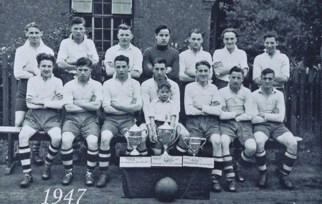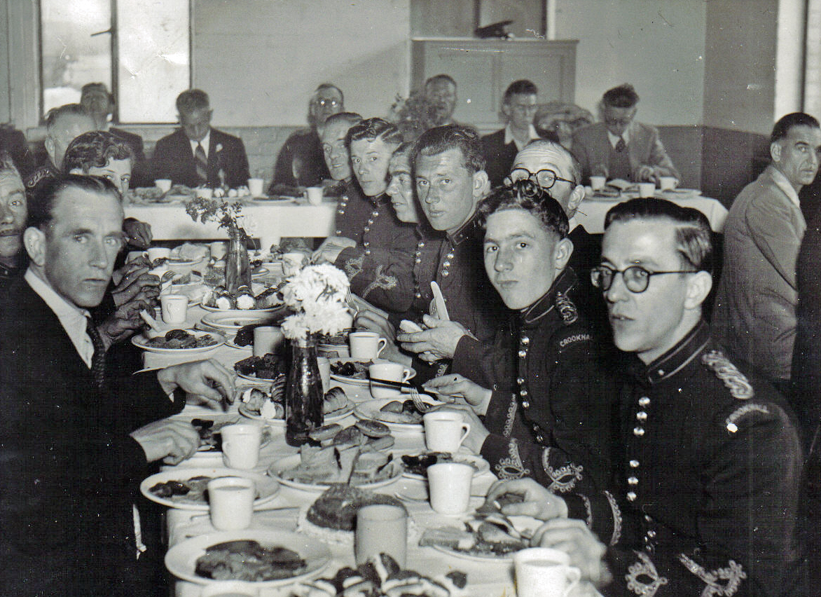 Photograph from the Consett Chronicle of Crookhall Juniors FC players and Committee (date unknown) at annual tea and presentation